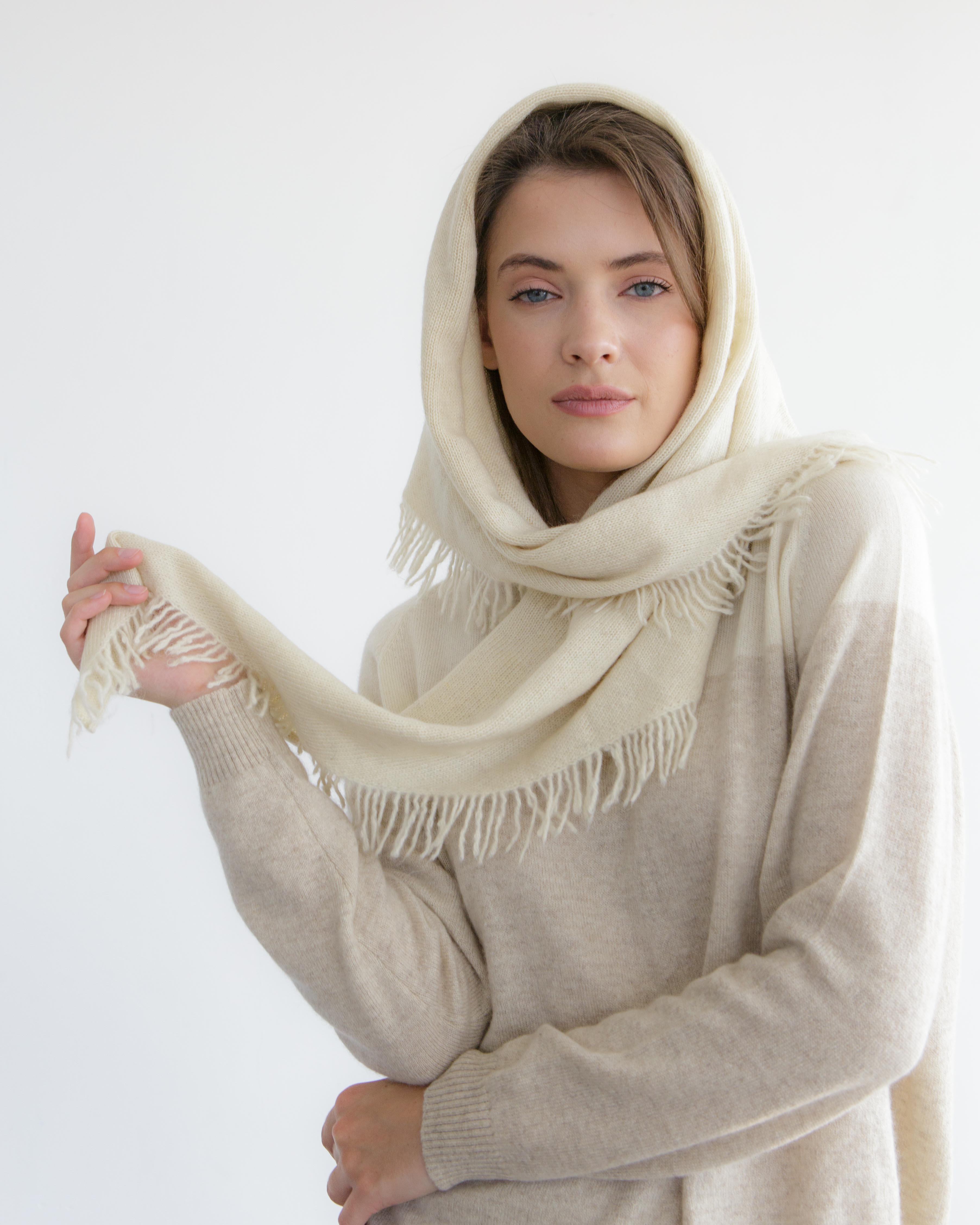 Шикарная косынка, цвет грязно-белый. Немного колется, но зато теплая. |