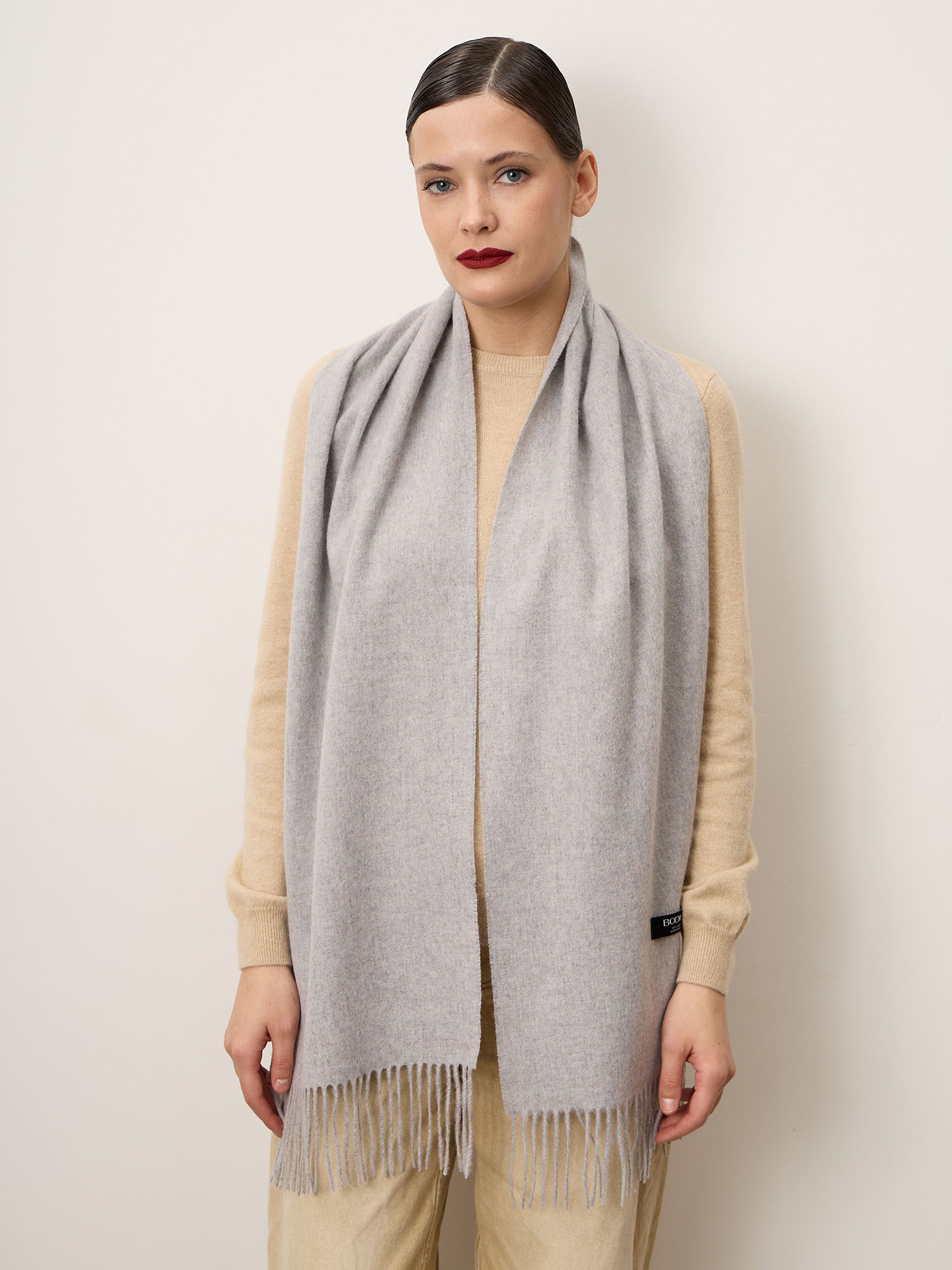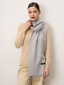 Классический прямоугольный формат с аккуратной отделкой и деликатной бахромой по краям. Лаконичный дизайн без лишнего декора делает шарф универсальным и актуальным вне времени. Оптимальная длина позволяет носить его свободно на плечах или оборачивать вокруг шеи.