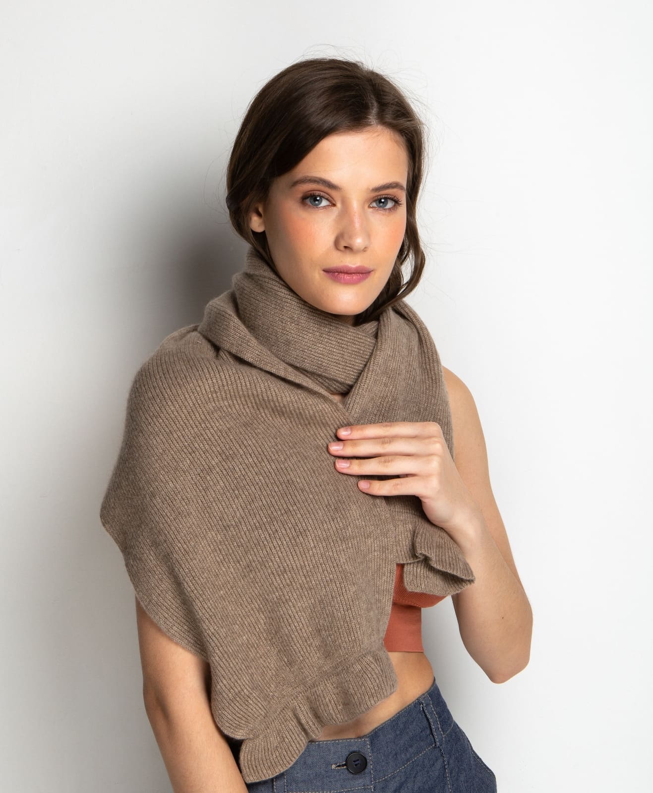 Лаконичный минималистичный дизайн без лишнего декора. Ровная аккуратная вязка подчёркивает премиальный статус изделия. Универсальный формат позволяет носить шарф как на плечах, так и оборачивать вокруг шеи, создавая многослойные образы.