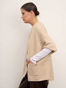 Интересная вещь. Можно носить на обе стороны, если спороть лейбл. Одна сторона светло/бежевпя с чуть заметным эффектом меланжа. Вкрапления, мне кажется, цвета капучино. Вторая сторона белая. Лацканы можно отворачивать как наружу, так и внутрь, тогда получается вырез углом - стройнит. Отсутствие воротника позволяет удобно набросить платок или шарф. Подходит буквально ко всему. И на все сезоны. Пройма как летучая мышь. Удобно. Полотно на спинке поперечной лицевой вязки переходит на рукава. Полочки с вертикальной лицевой гладью. Низ полочек по бокам плавно переходит на удлинение спинки. Полотно не тонкое, но пластичное, хорошо драпируется. Смотрится стильно и изысканно. На модели не совсем удачно демонстрируется, совсем не видно, что внутри белый цвет. Для меня это жилет с рукавами. Спасибо монголшопу и производителю за интересную идею, давно ждала нечто подобное. Но увидев название пончо, даже смотреть не стала. Думала, накидка. Потом снова наткнулась на фото, назвпние не прочла и открыла, рассмотрела, решила рискнуть. И риск себя оправдал. Рекомендую. Размер соответствует заявленному. Буду рада, если мой отзыв поможет вам в выборе. |