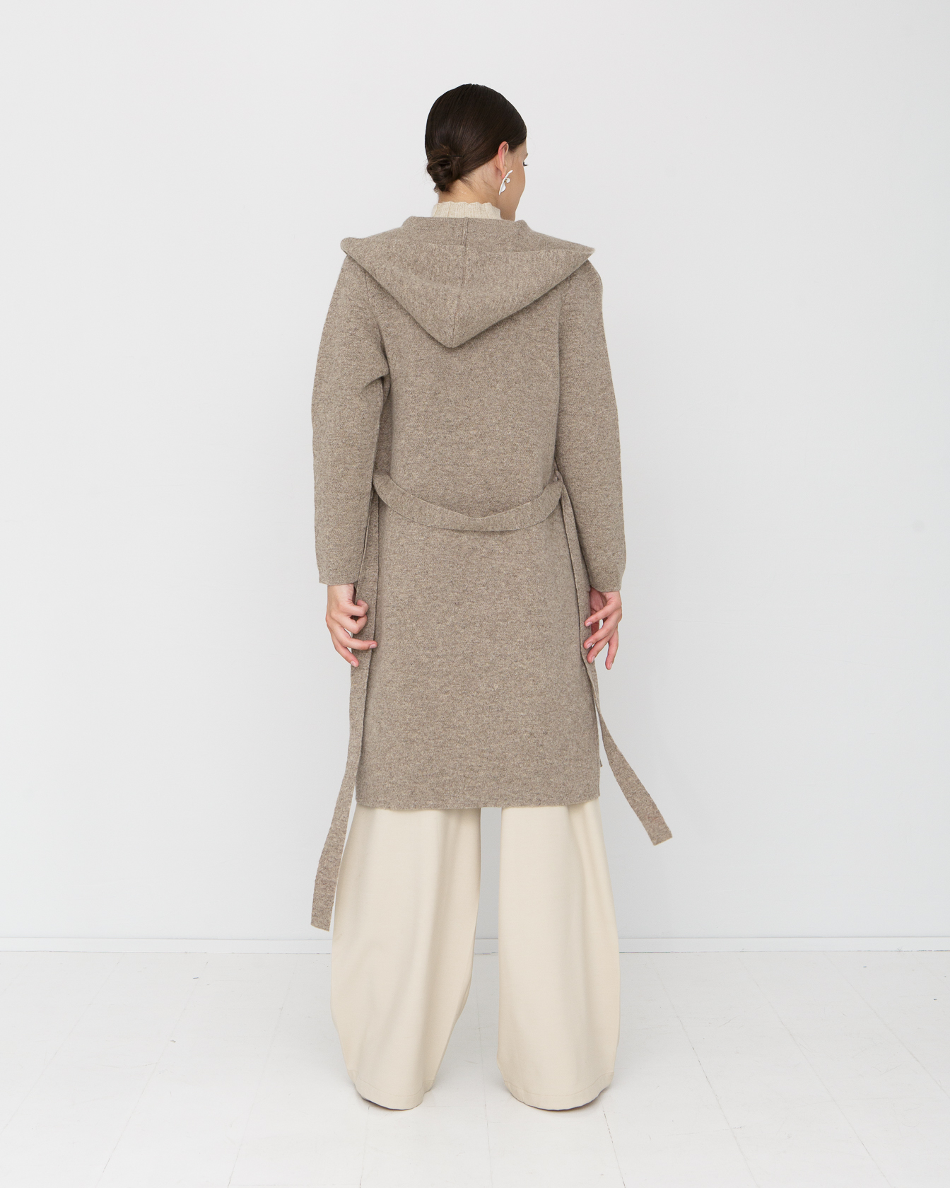открытое пальто до колен с капюшоном и внешники карманами на поясе