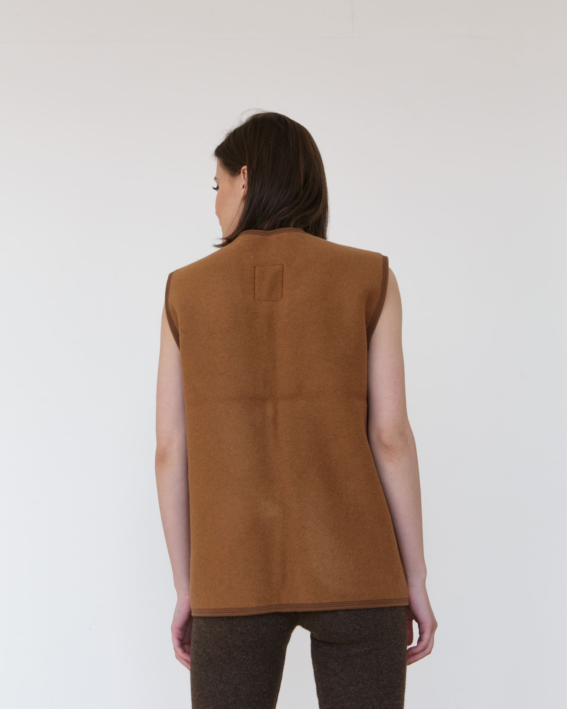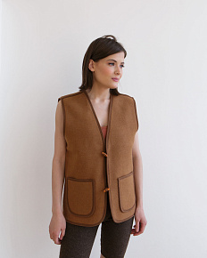 Валяная структура делает жилет плотным и устойчивым к ветру, при этом он остаётся мягким и приятным на ощупь. Такой способ обработки повышает износостойкость изделия и позволяет ему долго сохранять форму.