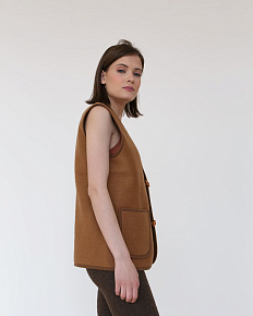 Прямой лаконичный крой без рукавов обеспечивает свободу движений и удобство в носке. Глубокий V-образный вырез, аккуратная отделка по краю и застёжка на пуговицы создают сдержанный, универсальный образ. Накладные карманы добавляют функциональности.